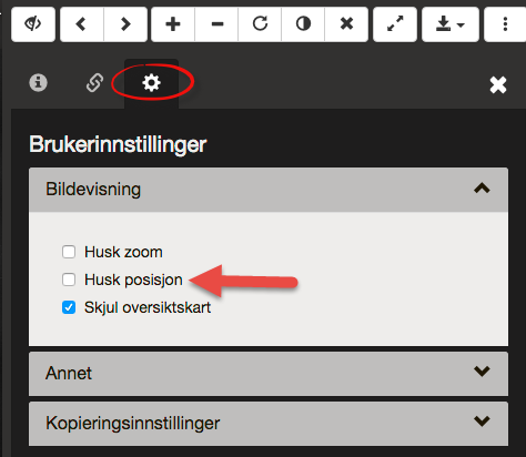 Then click on the gearwheel (marked with a red circle), to access your user preferences. Here you can choose "Remember position", by clicking on the checkbox named "Remember position"
