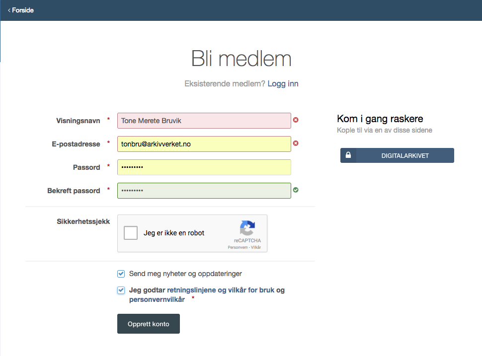Visningsnavnet må være unikt. Hvis det finnes fra før har du, eller noen andre, allerede opprettet en konto med dette visningsnavnet. Hvis det er din egen konto, så kan du logge deg inn på den og du slipper å lage en ny konto. Hvis du har en navnebror hos oss, må du endre visningsnavnet ditt. Vi vil at du skal bruke ditt egentlige navn, men du kan eventuelt legge til et mellomnavn hvis du har det, du kan legge til noen tegn i navnet ditt, for eksempel Tone_Merete_Bruvik, eller du kan legge til et sted etter navnet ditt, for eksempel Tone Merete Bruvik, Bergen.